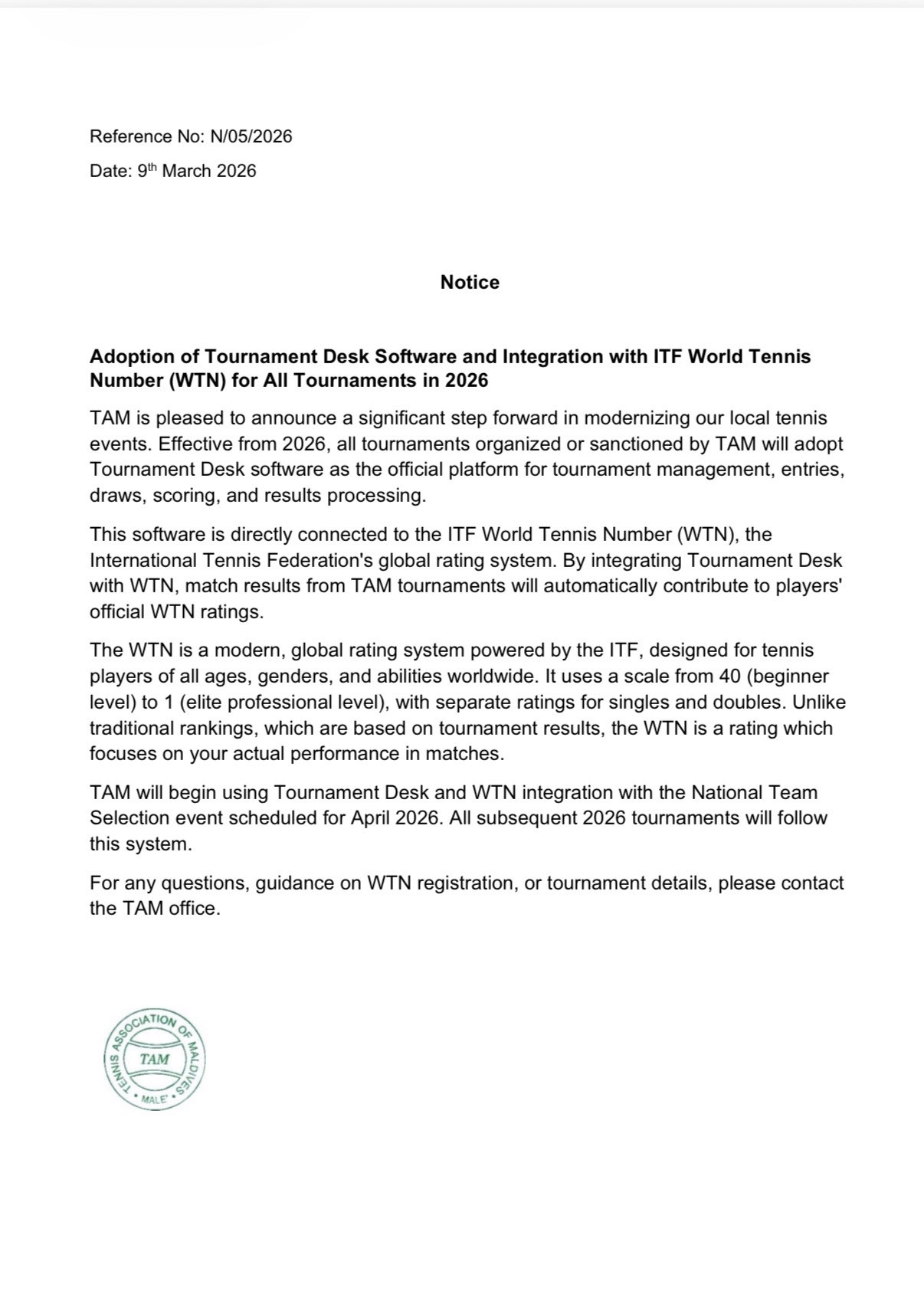 | 01/05/2026 | N052026 | N.06.2026 Adoption of Tournament Desk Software and Integration with IT World Tennis Number (WTN) for All Tournaments in 2026 - N.05.2026 Adoption of Tournament Desk Software and Integration with IT World Tennis Number (WTN) for All Tournaments in 2026 |